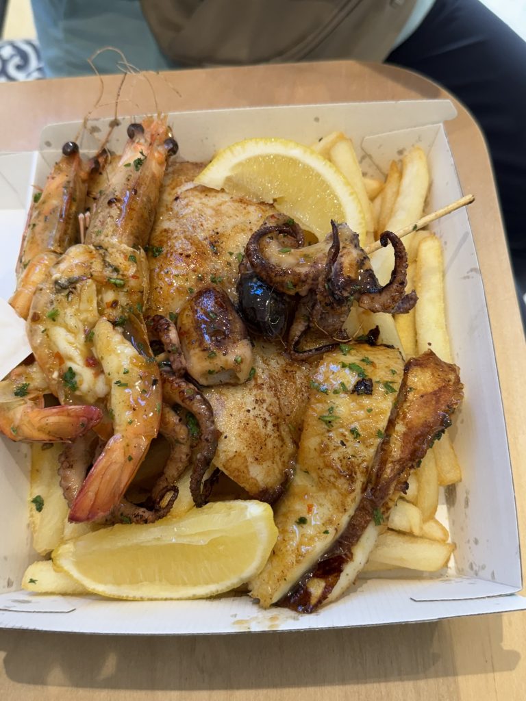 At Costicogee we had a great mixed grilled fish and chips with Pacific Dory, Prawns, calamari and octopus which was really tender and delicious, the picture doesn’t do the taste justice!