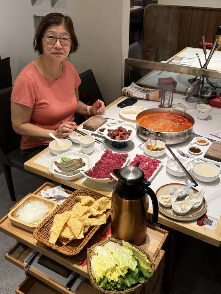 Had essentially a steamboat but with bells and whistles. Two sorts of beef plus beefsteak on dry ice and egg timer to say when cooked, prawns, dumplings, tofu skin, lettuce etc etc. and a DIY dipping sauce. All lovely (except something like dried pork bones)