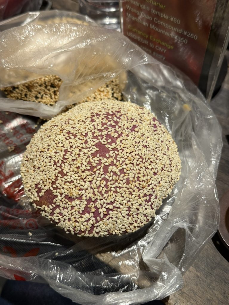 Finally we bought some local mooncakes (I think) different from usual, flat disks, less filling and drier. Also sessame biscuits like Indian puri, crispy, coated in sesame seeds and slightly sweet